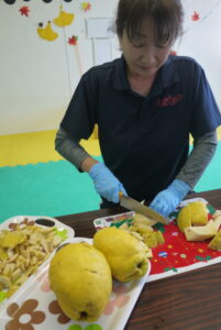 教室に戻ってからは、スタッフが一生懸命カリンをカットして、