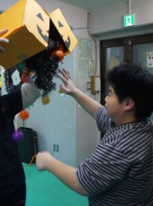 手作りのかぼちゃくす玉を2人1組で引っ張り、飛び出したハロウィンカラーのボールを集める!という活動です!