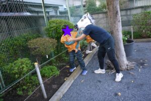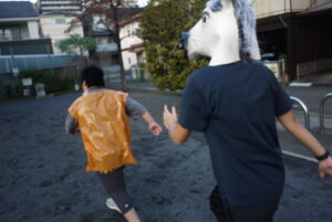 馬の被り物が大好きな子どもたちは、追いかけられると「キャー!!」と笑いながら